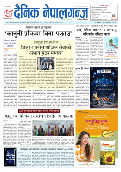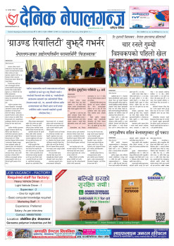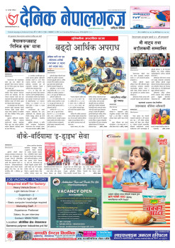 विज्ञापन पनि लगानी हो । नेपालगन्जबाट प्रकाशित प्रदेशकै क वर्गको दैनिक नेपालगन्ज पत्रिकामा विज्ञापन दिएर लाभ उठाउनु हुन अनुरोध गरिन्छ । विज्ञापनका लागि सम्पर्कः ९८०२५२०७११ कार्यालयः सम्यक सदन, नेपालगन्ज - १८ सनातन मार्ग, कारकादौ चोक नजिकै फोनः ०८१– ४१५१४३ सूचना तपाईको अधिकार हो । समाचारका लागि सम्पर्कः ९८५८०२०७११ (झलक गैरे) ९८५८०७०७११ (देवेन्द्रराज पौडेल)।